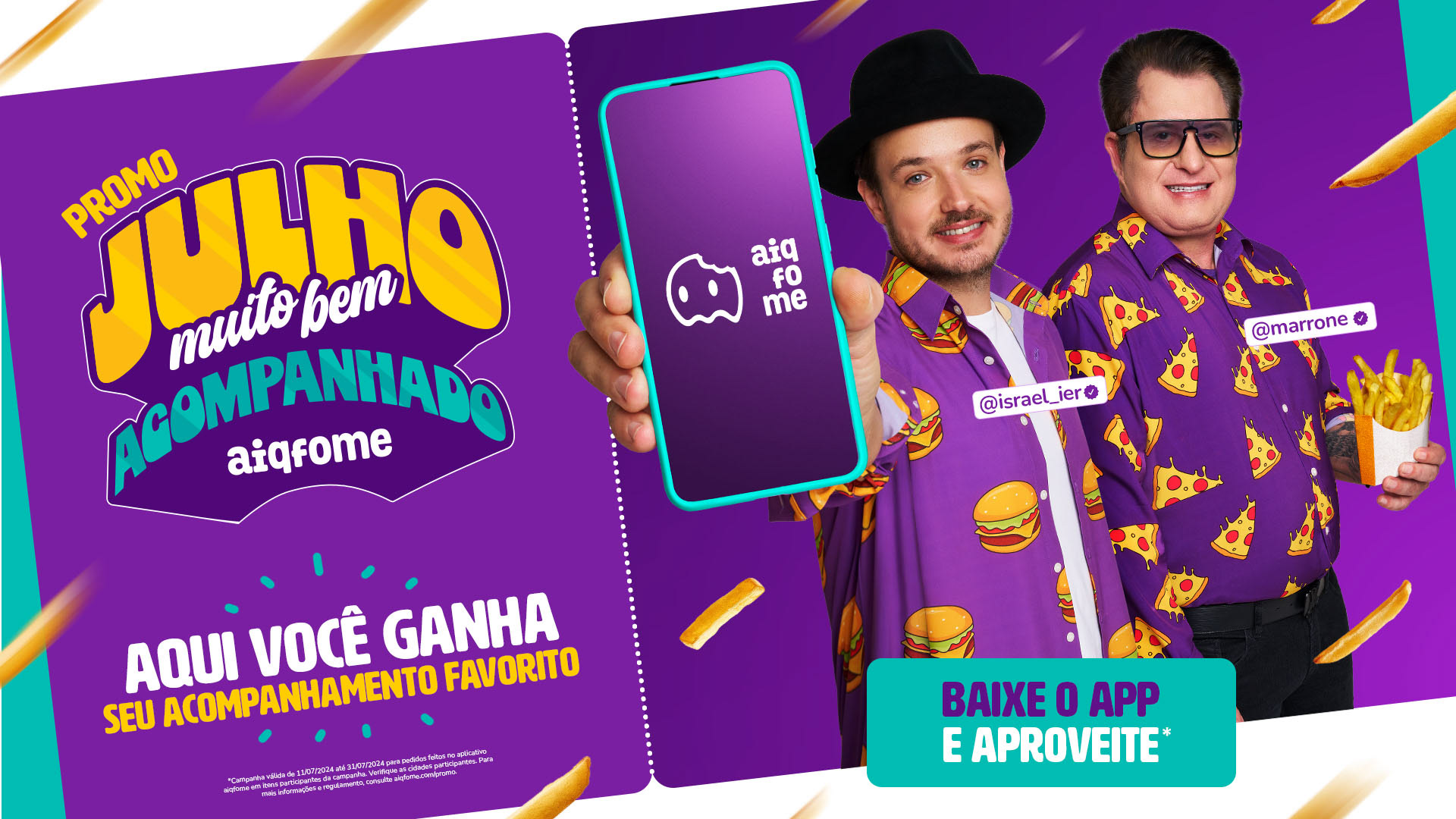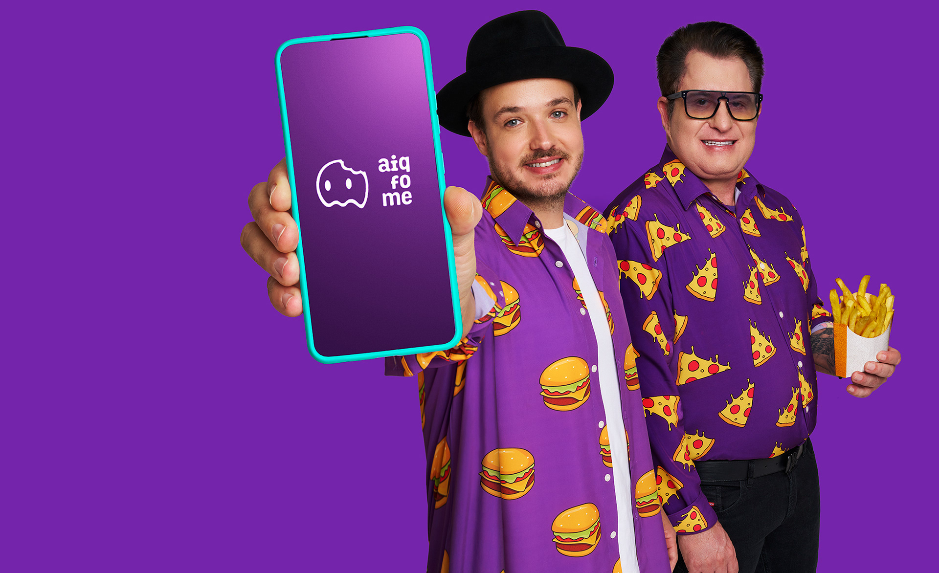 fotografia still para campanha BEM ACOMPANHADO do app AI Q FOME com os talentos Marrone e Israel Ribeiro